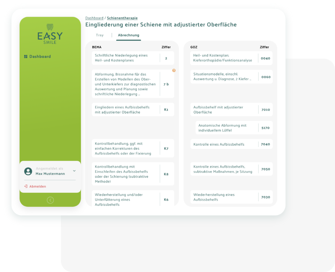 Damit sich Ihre Arbeit zukünftig noch mehr lohnt bietet Easy Smile eine vollständige Aufstellung der für die jeweilige Behandlung abrechenbaren Positionen. Durch Berücksichtigung der Abrechnungsgrundlagen von BEMA, GOZ und GOÄ ist Easy Smile für jede Praxis geeignet, egal ob für Kassen- oder Privatpatient*innen.