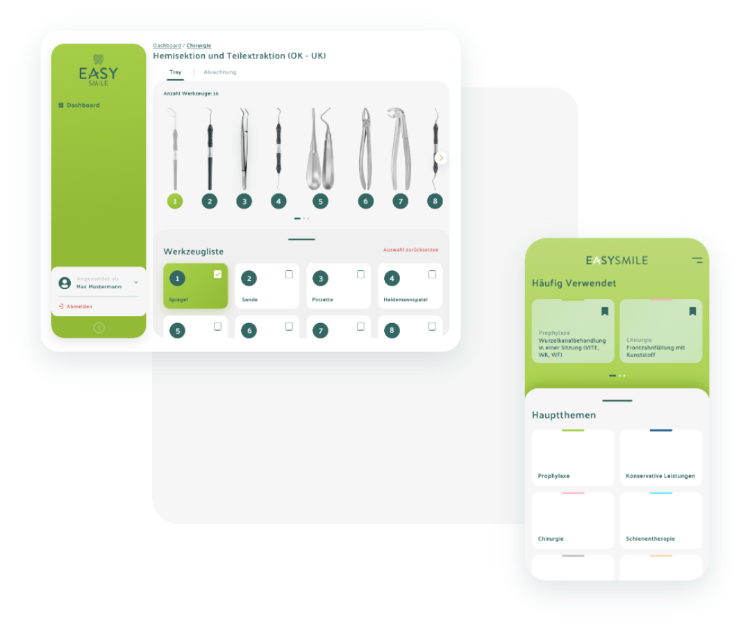 Easy Smile ist Ihr digitaler Assistent für Ihre Zahnarztpraxis. Erleichtern Sie Ihren Mitarbeiter*innen die Vorbereitung des Behandlungszimmers, die in einfach zu verstehenden, bebilderten Trays Schritt für Schritt dargestellt werden. So finden Ihre Zahnarzthelfer*innen schnell die richtigen Werkzeuge und Hilfsmittel, sodass die Behandlung Ihrer Patient*innen reibungslos ablaufen kann.